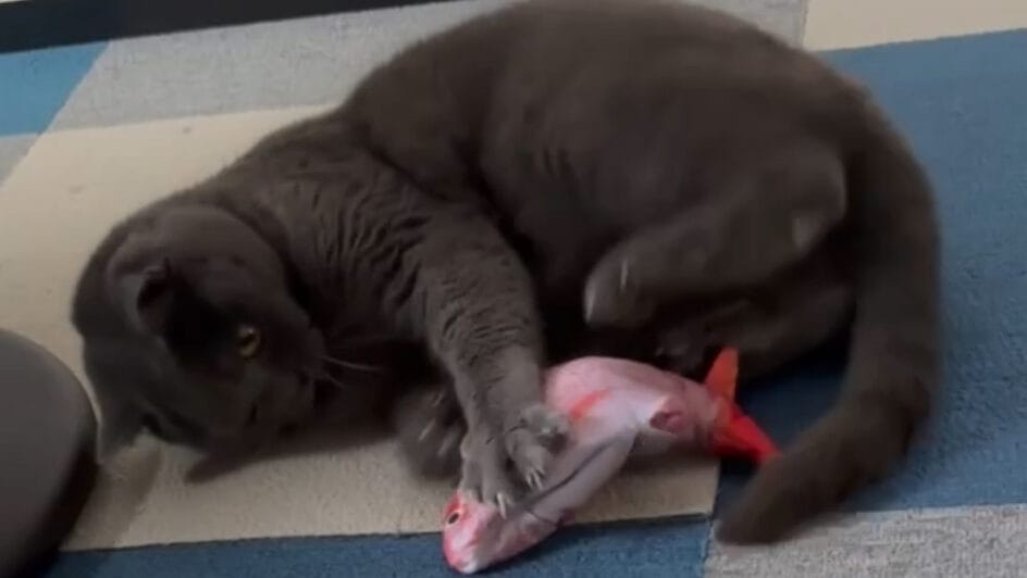 すると、さっきまでお昼寝モードだった愛猫の目が、見たこともないほどランランに! 普段は「お、動いてるね」と冷めた目で見守ることが多いブリティッシュですが、このお魚には我慢ができなかったようです。クンクンと匂いを嗅いだかと思ったら、野生を思い出したかのようにガバッ!と飛びつきました。